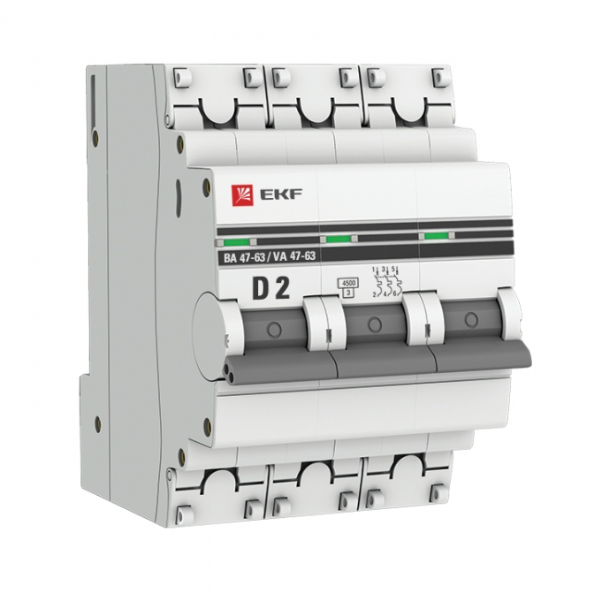 | Наименование в прайсе производителя | Автоматический выключатель 3P 2А (D) 4,5kA ВА 47-63 PROxima ЭКФ | |